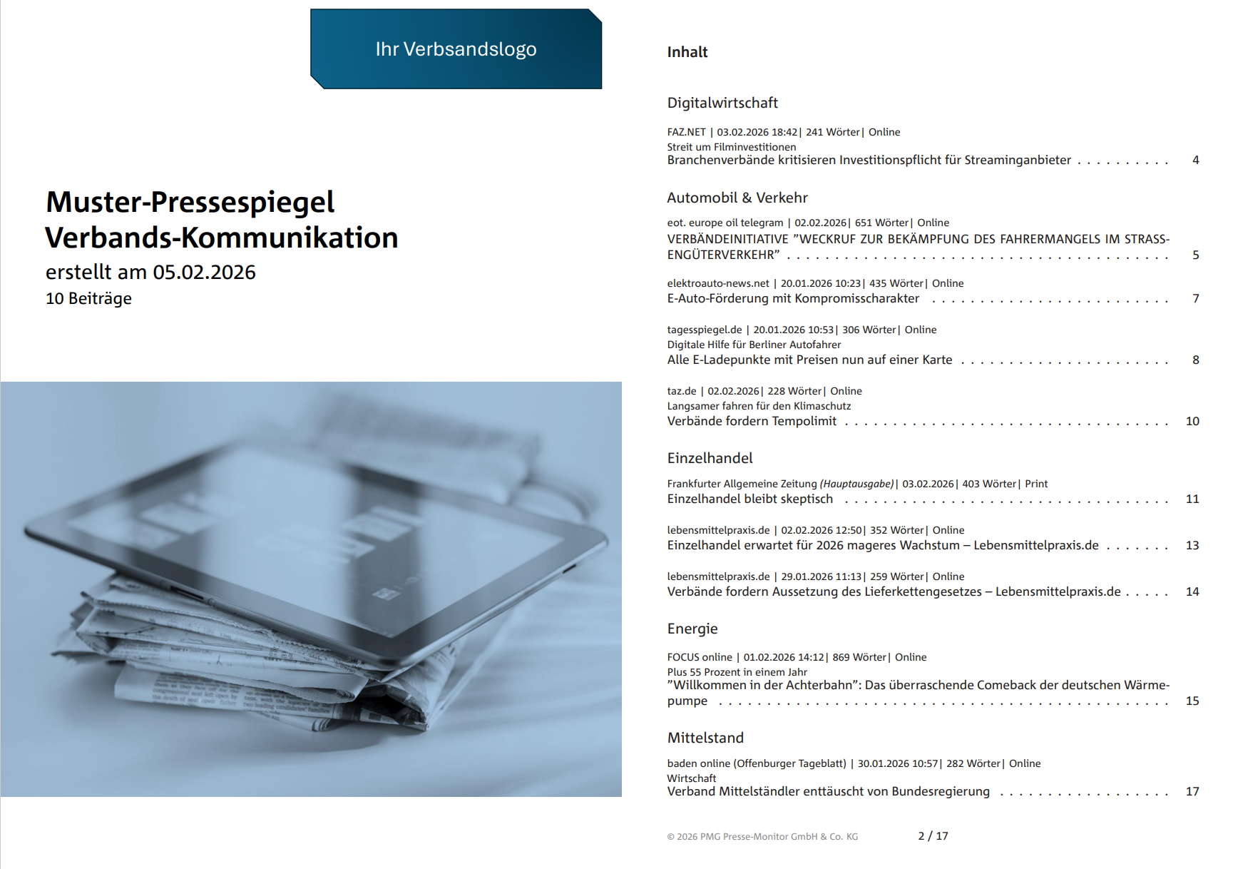 Ob täglicher Pressespiegel, themenbezogene Auswertung oder Nachweis Ihrer Kommunikationsarbeit: Die PMG liefert Ihnen die verlässliche Datenbasis, klare Nutzungsrechte und Werkzeuge, die sich nahtlos in Ihren Arbeitsalltag integrieren.